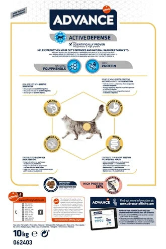 Advance Cat Adult Sensitive Salmon is een volledig en speciaal samengesteld droogvoer voor volwassen katten met een gevoelige maag of huidproblemen. Deze voeding bevat zalm als enige eiwitbron in combinatie met licht verteerbare rijst. Dit maakt het kattenvoer zeer geschikt voor katten die gevoelig reageren op andere dierlijke eiwitten of granen. Dankzij de toevoeging van Omega-3 en Omega-6 vetzuren draagt dit voer bij aan een gezonde huid en een glanzende vacht.