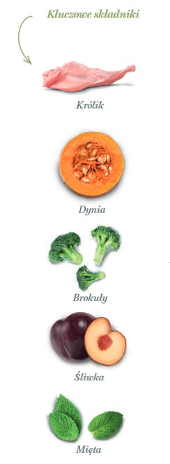 Świeżo przygotowany królik 68% (używamy 140 kg świeżo przygotowanego królika do wytworzenia 100 kg naszego produktu), cały zielony groszek, białko grochu, odwodniony ziemniak, maczka chleba świętojańskiego, hydrolizat królika, błonnik jabłkowy, drożdże (Saccharomyces cerevisiae), minerały, olej z kurczaka (chroniony naturalnymi tokoferolami), tapioka, nasiona lnu (naturalne źródło kwasów tłuszczowych omega 3), olej rybny (chroniony naturalnymi tokoferolami), psyllium, odwodniony jarmuż, kryl antarktyczny, wodorosty kelp, spirulina, odwodniona dynia 1,000 mg/kg, odwodnione brokuły 1,000 mg/kg, odwodnione śliwki 1,000 mg/kg, cykoria (źródło FOS) 1,000 mg/kg, hydrolizowana ściana komórkowa drożdży (źródło MOS) 1,000 mg/kg. ściana komórkowa drożdży (źródło MOS) 1,000 mg/kg, ekstrakt z mandarynki, imbir, rozmaryn 500 mg/kg, yucca schidigera.