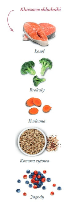 Świeżo przygotowany łosoś + hydrolizat rybny – białko i smakowitość. Hydrolizat to białko rozbite na mniejsze cząsteczki, zwykle dobrze akceptowane i lekkostrawne.