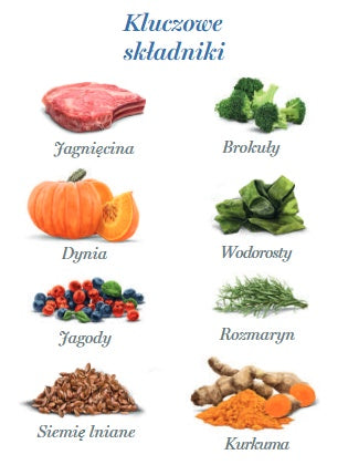 jagnięcina 85% (w tym 60% świeża jagnięcina, 25% bulion jagnięcy), dynia 5%, białko ziemniaczane, ziemniaki 2%, żurawina, minerały, olej słonecznikowy, siemię lniane 0,03%, inulina (źródło FOS) 0,02%, hydrolizowana ściana komórkowa drożdży (źródło MOS) 0,02%, chondroityna 200 mg/kg, brokuły 100 mg/kg, wodorosty morskie 100 mg/kg, rozmaryn 100 mg/kg, kurkuma 100 mg/kg