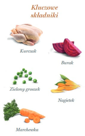 świeży kurczak 65%, zielony groszek 2%, marchew 2%, olej słonecznikowy, minerały, glukozamina 300 mg/kg, chondroityna 300 mg/kg, inulina (źródło FOS) 0,02%, hydrolizowana ściana komórkowa drożdży (źródło MOS) 0,02%, burak 0,01%, nagietek.