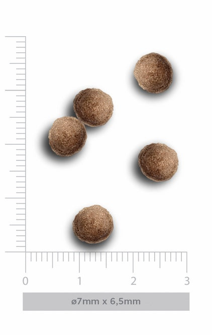 Drobne granulki – dostosowane do potrzeb szczeniąt małych ras, ułatwiają gryzienie i trawienie.