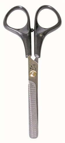 While straight scissors can easily nick the coat, double-serrated scissors create a more natural effect. Thinning scissors are primarily used for thinning the coat. The plastic grip makes the scissors easy to handle.