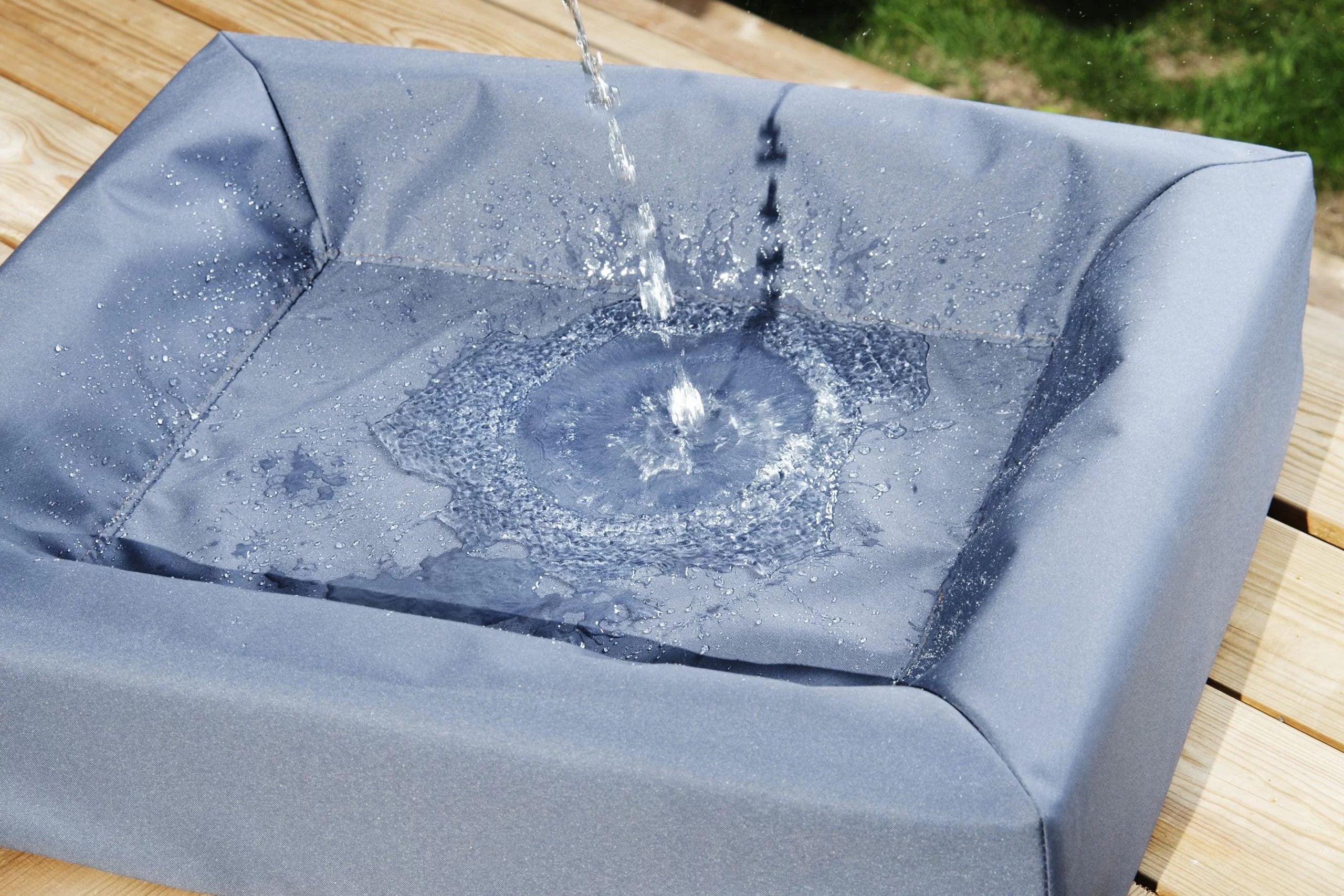 Deze outdoor hoes is ontworpen met een geavanceerde coatingtechniek die voorkomt dat water in het materiaal trekt. Regen stroomt eenvoudig van de zijkanten af, en als er water in de kuip blijft staan, kan dit eenvoudig verwijderd worden. Het materiaal droogt snel, en dankzij de speciale onderkant is het bed beschermd tegen optrekkend vocht. Hierdoor kan het Bia Bed het hele jaar door buiten blijven liggen.
