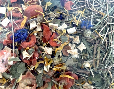 Ingredients: Hay, carrots, parsley root, chicory root, celery, rosehip shells, birch leaves, cauliflower blossoms, marigold blossoms, currant leaves, common primrose, rose blossoms (vegetables 2.6%, blossoms 0.2%, leaves 0.2%)