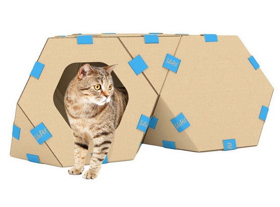 Konstrukcja produktu pozwala łączyć ze sobą nieskończoną liczbę domków, zamieniając zwykłe miejsce do spania w wielofunkcyjny kompleks, w którym kot może się bawić i odpoczywać.