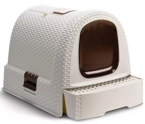 Estetyczna, przypominająca rattanowy kosz kuweta dla kota z wysuwaną szufladą i schowkiem na akcesoria (łopatka i mata czyszcząca łapki w zestawie), niezwykle łatwa w montażu i czyszczeniu. Kuweta posiada szczelne zatrzaski ograniczające wysypywanie się żwirku i filtr przeciwzapachowy, dla zwiększonego komfortu użytkowania. Jej obudowa, wyposażona w uchwyt, jest łatwa do przenoszenia.