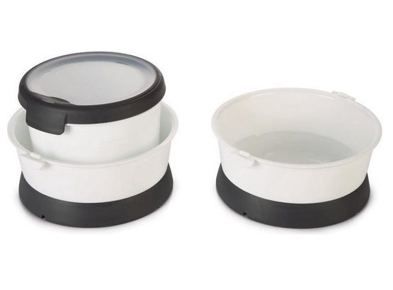 Zestaw zawiera dwie miski oraz szczelnie zamykany pojemnik.