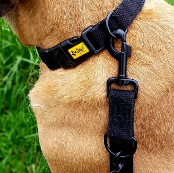 Obroża dla psa wykonana z bawełny o ciekawym splocie. Posiada bardzo ładne czarne okucia, które dodają charakteru i wyjątkowego wyglądu. Zapinana na plastikową, wytrzymałą klamrę klik-klak, ozdobioną logo Dingo. Wszystkie te elementy powodują, że obroża prezentuje się bardzo ładnie.