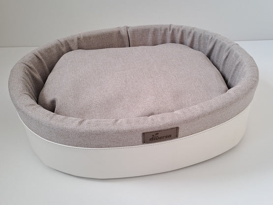 Legowisko posiada wyjmowaną poduszkę, która została wypełniona miękką mieszanką, zapewniającą komfort podczas wypoczynku oraz izolację od podłoża. Poduszka w pełni nadaje się do prania w pralce. Obrzeża zostały wykonane z grubszej pianki, która zapewnia wygodę podczas leżenia a przy tym nie traci swoich pierwotnych kształtów. Użyta eco-skóra nadaje elegancji legowisku, a także ułatwia utrzymanie w czystości posłania, które wystarczy jedynie przetrzeć wilgotną szmatką, aby znów było perfekcyjne.