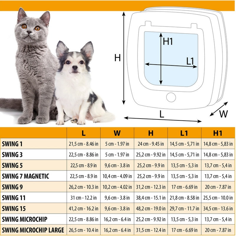 Dodatkowo modele Swing 5, 7 i 9 są wyposażone we wskaźnik przejścia, który pomoże ci błyskawicznie ocenić, gdzie znajduje się twoje zwierzę. Wskaźnik przejścia to "flaga" umieszczona na dnie klapy - będzie wskazywała kierunek, w którym twój pupil ostatnio przechodził.