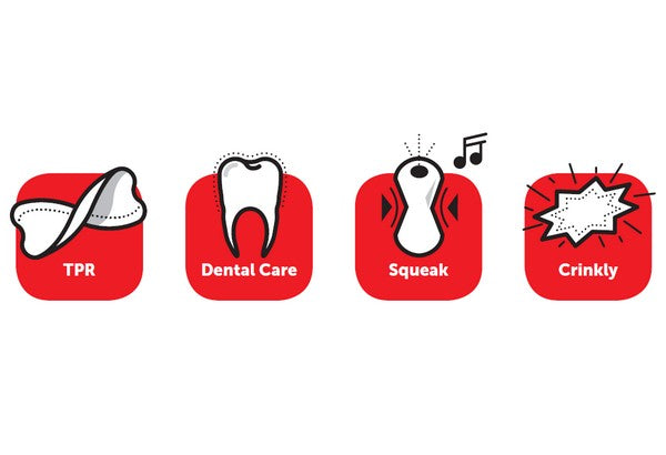 • Zabawki posiadają wypustki, które przy gryzieniu masują dziąsła psa i zapobiegają osadzaniu się kamienia nazębnego.