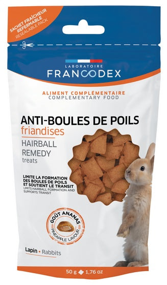 Okres linienia u królika to czas, w którym nawet przy bardzo dobrej diecie zwierzę może połykać więcej sierści niż zwykle. To naturalne podczas codziennej pielęgnacji, ale nadmiar włosa w przewodzie pokarmowym potrafi stać się realnym problemem: spada apetyt, pojawia się mniejsza ilość bobków, brzuch bywa wzdęty, a królik staje się osowiały. Francodex przysmak dla królików zapobiegający zakłaczeniu to karma uzupełniająca w formie apetycznych przekąsek, zaprojektowana z myślą o wsparciu pasażu jelitowego w czasie linienia oraz wtedy, gdy królik ma skłonność do tworzenia się czopów z sierści.