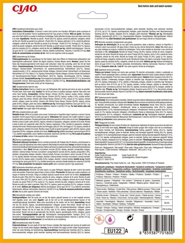 Analytical constituents: Crude protein (min) 7%, crude fat (min) 0.2%, crude fiber (max) 0.3%, moisture (max) 91%, Vitamin E (min) 310 IU/kg, taurine (min) 0.025%