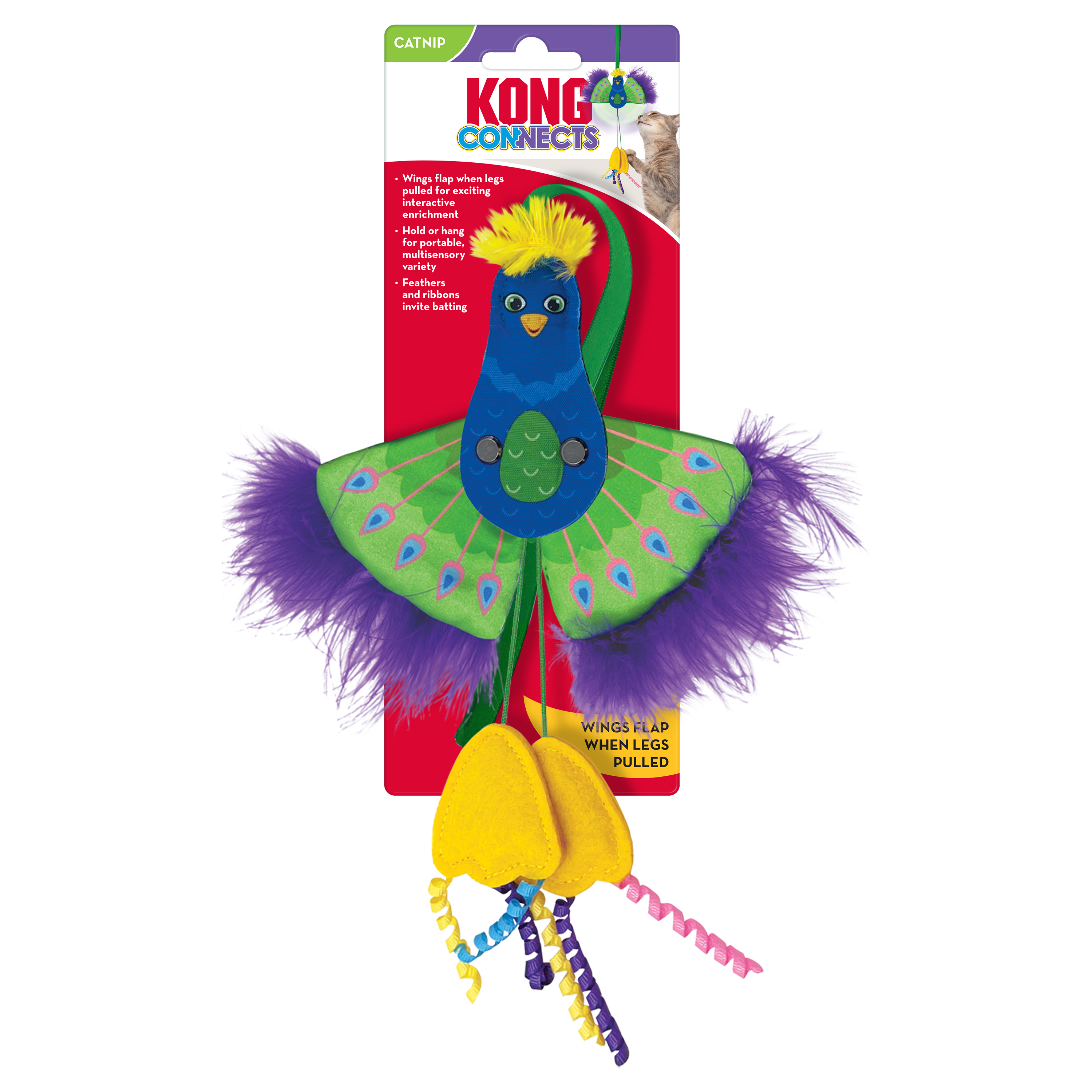 KONG Connects Peacock’s dangling legs invite play and when pulled—the wings flap for irresistibly feathery action that sparks hunting instincts. Held for interactive play or attached to a door for solo enrichment, ribbons and feathers invite batting and KONG Premium North American Catnip in feet prolong the fun.