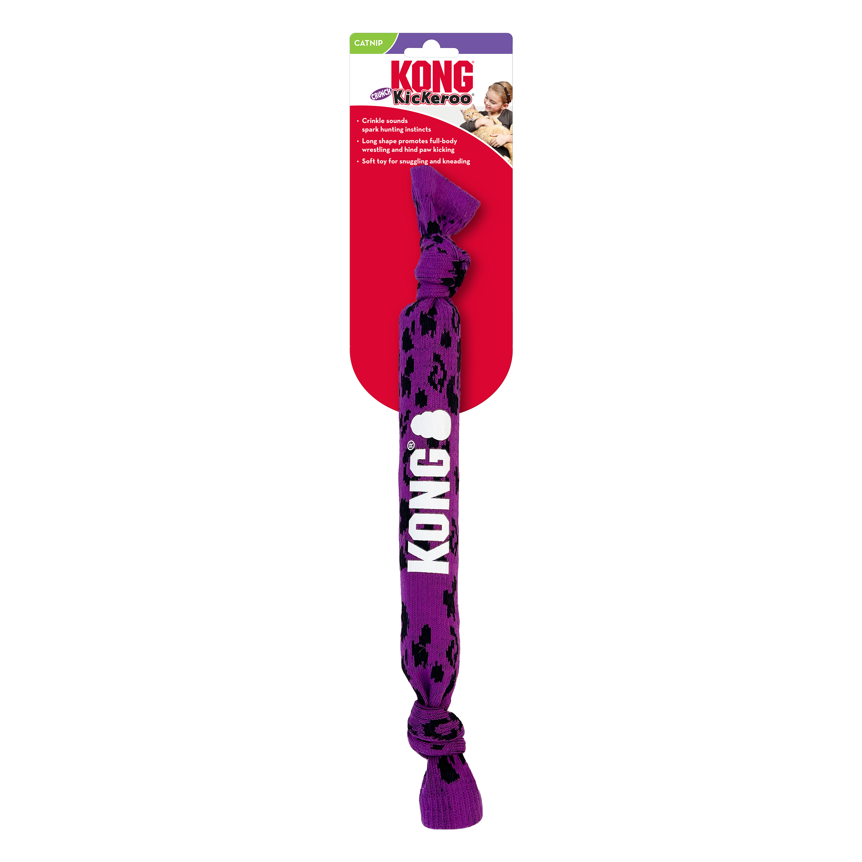 KONG Kickeroo Crunch crinkles as cats play, sparking natural hunting instincts. The extra-long body invites the healthy, full-body wrestling and hind paw kicking that cats just can’t get enough of. KONG Premium North American Catnip inside boosts mood and prolongs play with a soft toy that’s ideal for kneading and snuggling, too.