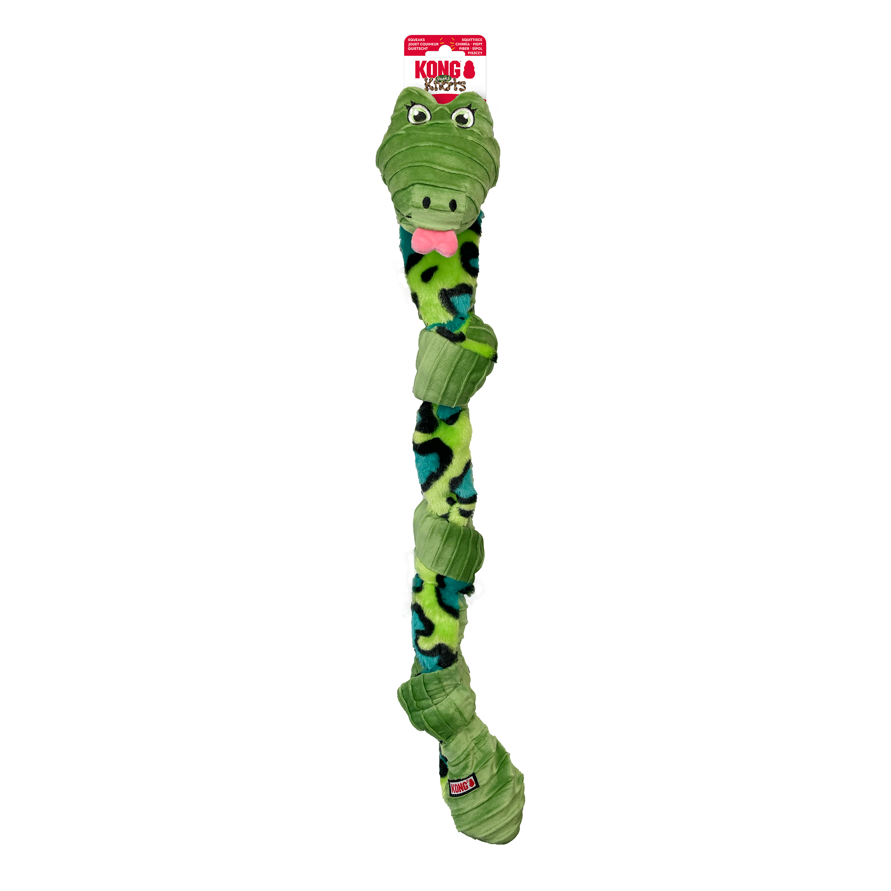 KONG Knots Snake is soft on the outside and tough on the inside—thanks to an internal knotted rope that satisfies dogs’ natural instincts. This long, floppy friend is ideal for shaking, tugging and tossing with squeakers inside that prolong play. This silly serpent is skinny enough for all sizes of dogs to grab on to a long buddy ideal made for long-lasting solo and interactive play.