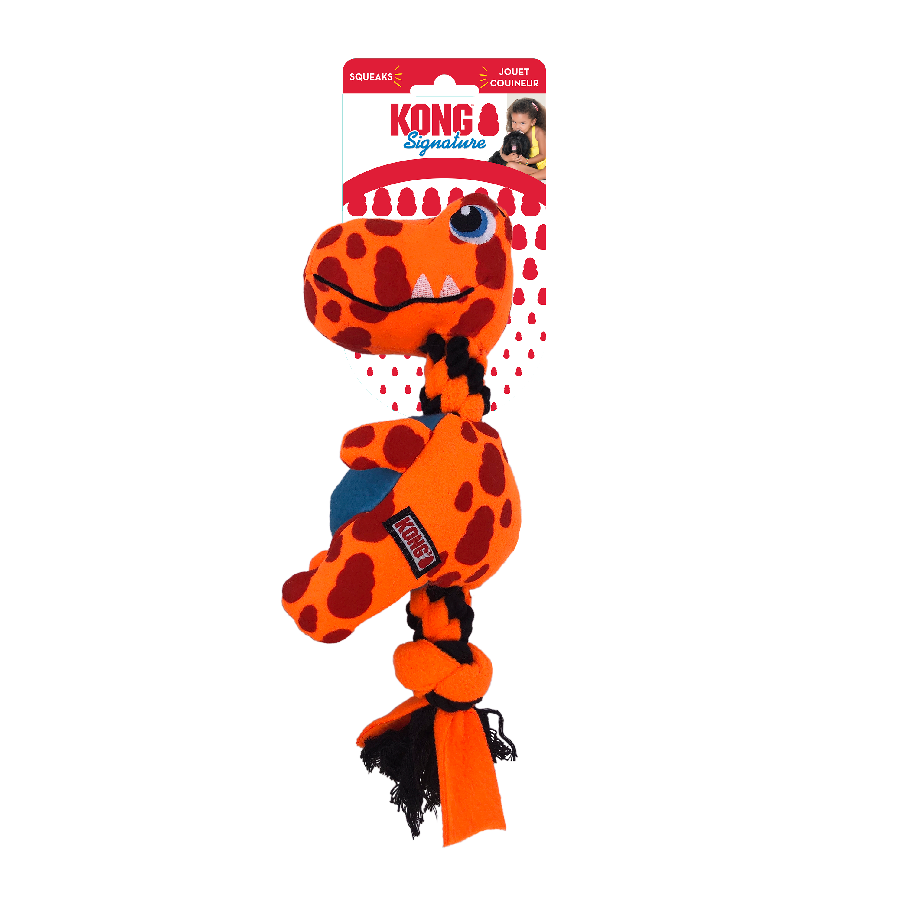 KONG Signature Dynos have a stretchy, strong fleece rope spine from head to tail, boosting their strength during tug-and-shake adventures. Soft, floppy bodies invite instinct-satisfying shaking and tugging while their mighty squeaks fuel long bouts of Jurassic play.