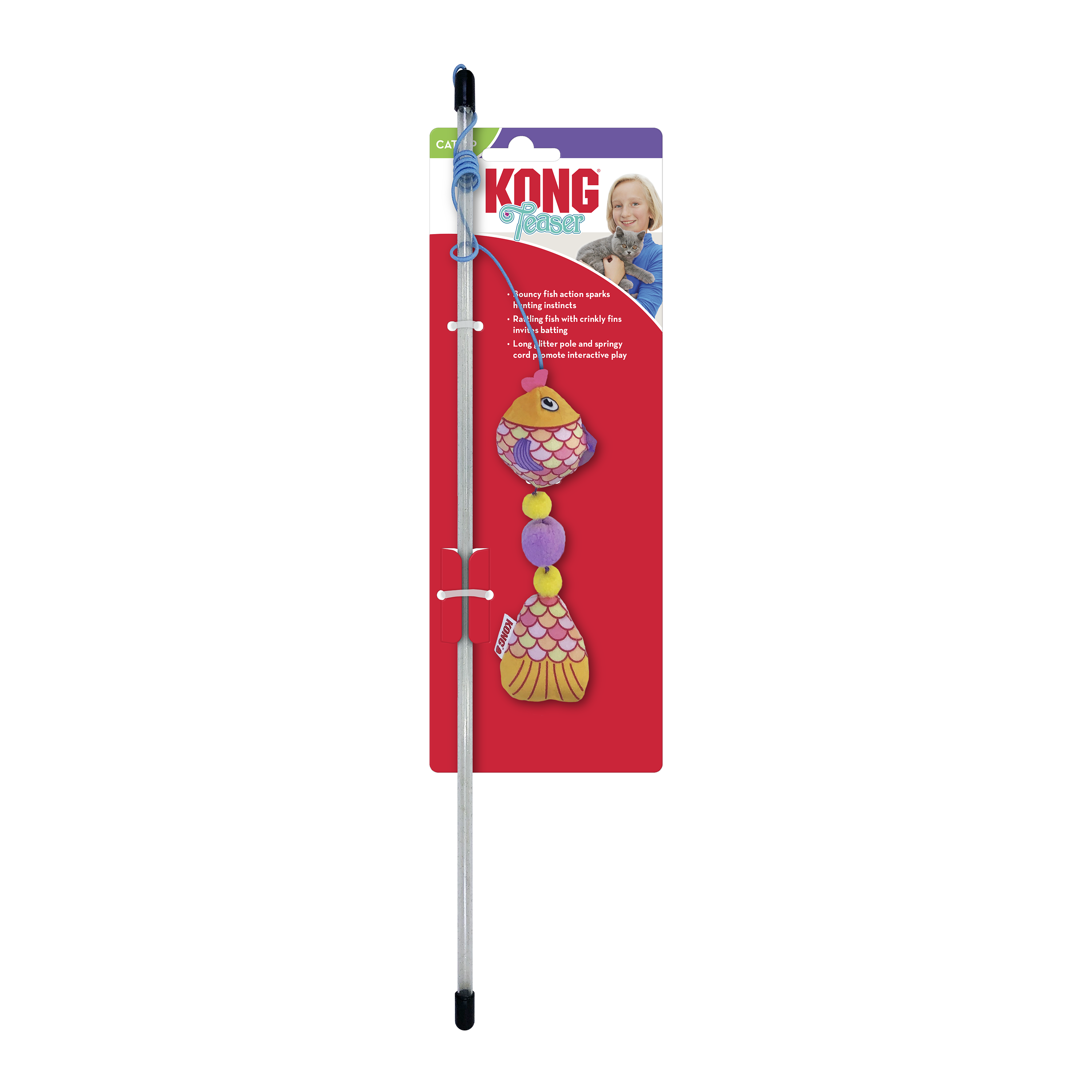 KONG Teaser Scrattles Fish keeps cats on the hook with a rattling, dangling fish with bouncing action that sparks natural hunting instincts. The long glitter pole and elastic cord promote interactive play. The fish’s crinkly fins and long body invite batting while KONG Premium North American Catnip inside prolongs the fun.