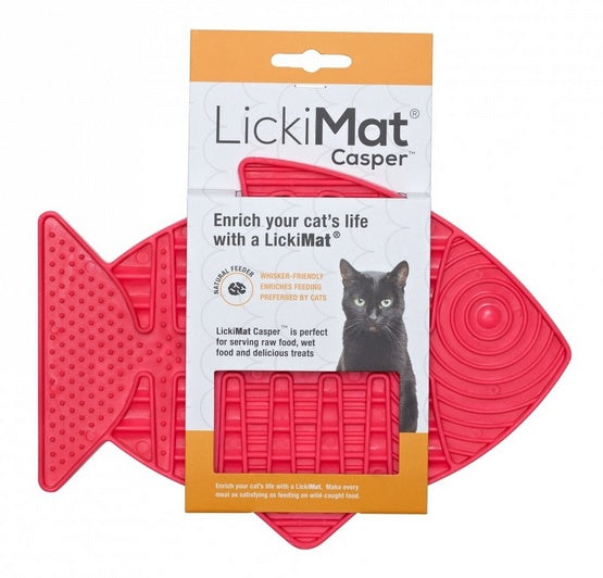 LickiMat Classic Casper to pierwsza mata dedykowana dla kotów w cudownym kształcie rybki. Jest płaska, więc nie drażni wibrysów oraz pozwala spożywać pokarm w pozycji kucającej z pełnym widokiem na otoczenie, co pomaga zmniejszyć stres i niepokój podczas jedzenia. Sprawdzi się świetnie również dla mniejszych psów!