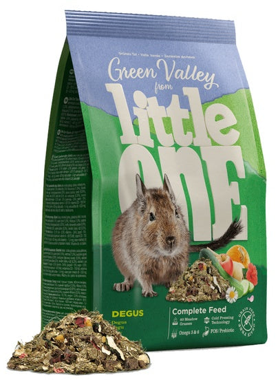 Little One Zielona Dolina - pokarm dla koszatniczek to dekoracyjna karma dla zwierząt, w skład której wchodzi sześćdziesiąt traw łąkowych i ziół. Pokarm stworzono przy użyciu specjalnej technologii tłoczenia na zimno. Dzięki temu karma zachowuje wszystkie witaminy, minerały i inne składniki odżywcze zawarte w roślinach. Pokarm Little One Zielona Dolina jest bogaty w długie włókna, które zadbają o zęby i przewód pokarmowy koszatniczek. Dieta wzbogacona jest o fruktooligosacharydy - naturalne prebiotyki, które wspomagają korzystną dla wzrostu mikroflorę w jelitach.