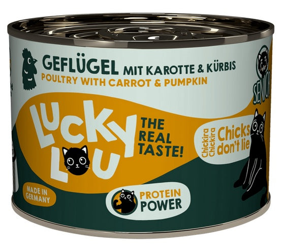 Gdzie indziej jest nudne standardowe jedzenie - Lucky Lou jest dostępne w 18 różnych odmianach smakowych w saszetkach 125 g oraz w puszkach 200 g i 400 g. Karma produkowana w Niemczech.