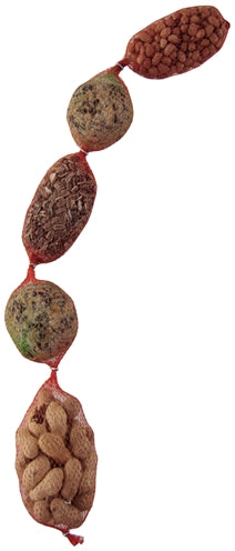 Slinger met 3 netjes gevuld met zonnepitten, pinda's en doppinda's en 2 vetbollen. Vogels kunnen in de winter best een steuntje in de rug gebruiken. Voedsel is schaars. Met het ophangen van deze slinger steekt u hen een helpende hand toe.