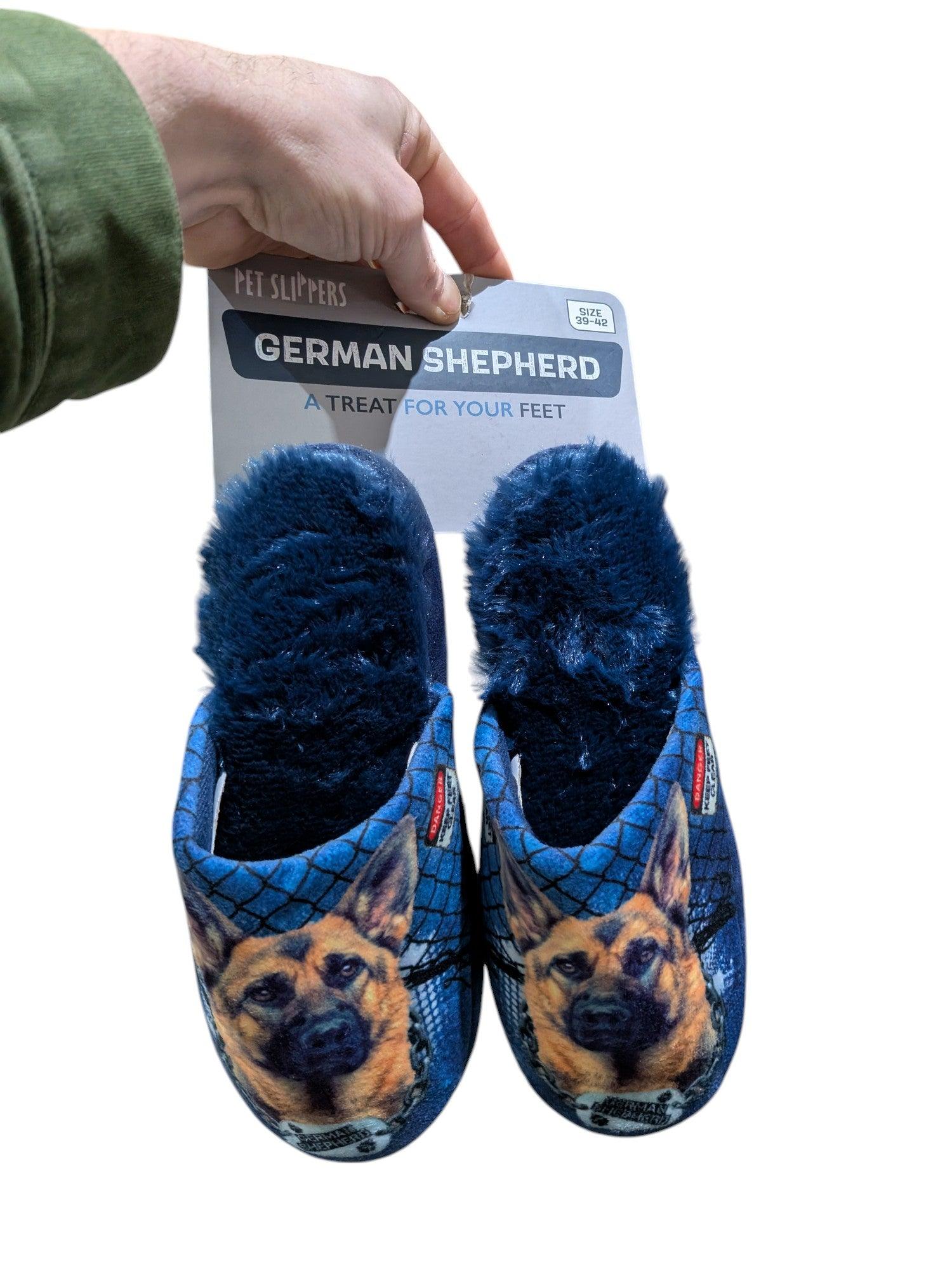 The German Shepherd Dark Blue Slippers (sizes 39-42) are animal-print slippers that offer ultimate warmth and comfort, perfect for cozy moments at home. Made from soft material and equipped with a thick sole, they provide a wonderfully warm experience and a luxurious feel with every step. The charming animal print adds a playful touch to your relaxation time.