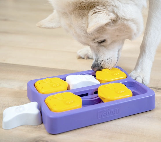 Gra Brick Small zachęca do swobodnej zabawy w poszukiwanie smakołyków! Zacznij od napełnienia przegródek przysmakami lub suchą karmą. Potem zachęć pupila do eksploracji zabawki.