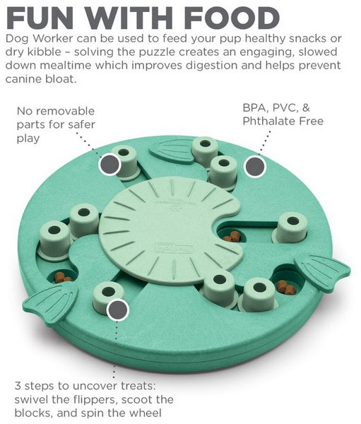Gra Dog Worker Green zachęca do swobodnej zabawy w poszukiwanie smakołyków! Zacznij od napełnienia przegródek przysmakami lub suchą karmą. Potem zachęć pupila do eksploracji zabawki.