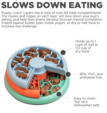 Gra Lickin Layers Puppy zachęca do swobodnej zabawy w poszukiwanie smakołyków! Zacznij od napełnienia przegródek przysmakami lub suchą karmą. Potem zachęć pupila do eksploracji zabawki.
