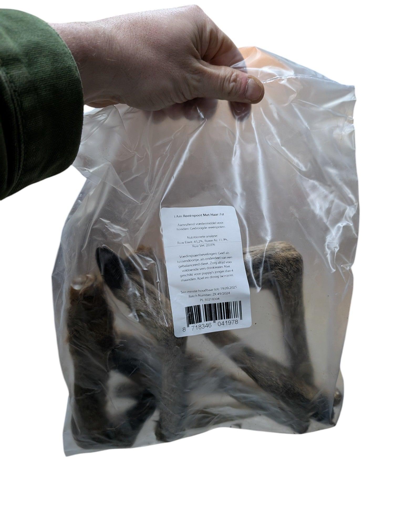 The Petsnack Deer Paw with Hair 7 pcs dog snack is a supplementary pet food for dogs to chew on and is a natural treat for your dog. Your dog can of course gnaw on these all-natural deer paws from Petsnack! This delicious snack consists of the lower part of a deer's paw and is 100% natural. The dried skin is delicious to eat and the bone and hoof are great for gnawing on. This keeps your pet busy with this healthy snack for a long time and helps to care for their teeth and gums through gnawing.