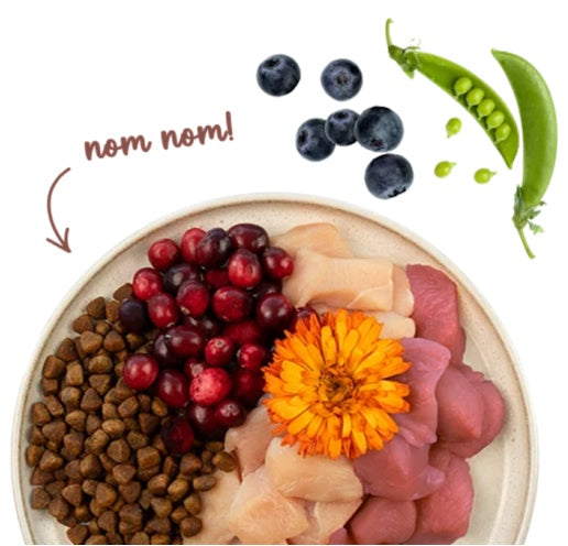 świeże mięso z kurczaka (20%), jęczmień, kukurydza, białko drobiowe (suszone), skwarki (suszone), białko kukurydziane, świeża perliczka (5%), włókno grochu, hydrolizat białka, suszony miąższ buraczany (bez cukru), tłuszcz zwierzęcy, ryż (1%), mączka wątrobowa, olej z łososia (0,5%), węglan wapnia, groch (suszony, 0,4%), chlorek potasu, borówki brusznice (suszone, 0,1%), borówki (suszone, 0,1%), suszona pietruszka (0,1%), drożdże (suszone, 0,1%), kwiaty nagietka (suszone, 0,05%)
