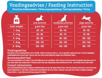 Introduceer deze voeding geleidelijk over een periode van 7 dagen om spijsverteringsproblemen te voorkomen. Zorg dat jouw hond altijd toegang heeft tot vers drinkwater. Bewaar het voer op een koele, droge plaats.