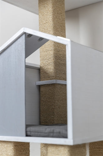 The Trixie Be Nordic Cat Tree Jonte Grey/White 115 cm is a fun cat tree with two perches, a sheltered house, and various scratching options. This cat tree is a real eye-catcher in the home! The tree gives the feeling of a beach house, with the white little house on legs and a perch. The legs and the pole leading to the perch are wrapped in sisal, where your cat can scratch to its heart's content. On the perch, he can take a nice nap or keep an eye on what's happening in the house. For a good night's sleep or a more sheltered power nap, he can retreat to the house. Both the perch and the house are equipped with a comfortable cushion that can be hand-washed. This cat tree is a real must-have in every cat household!