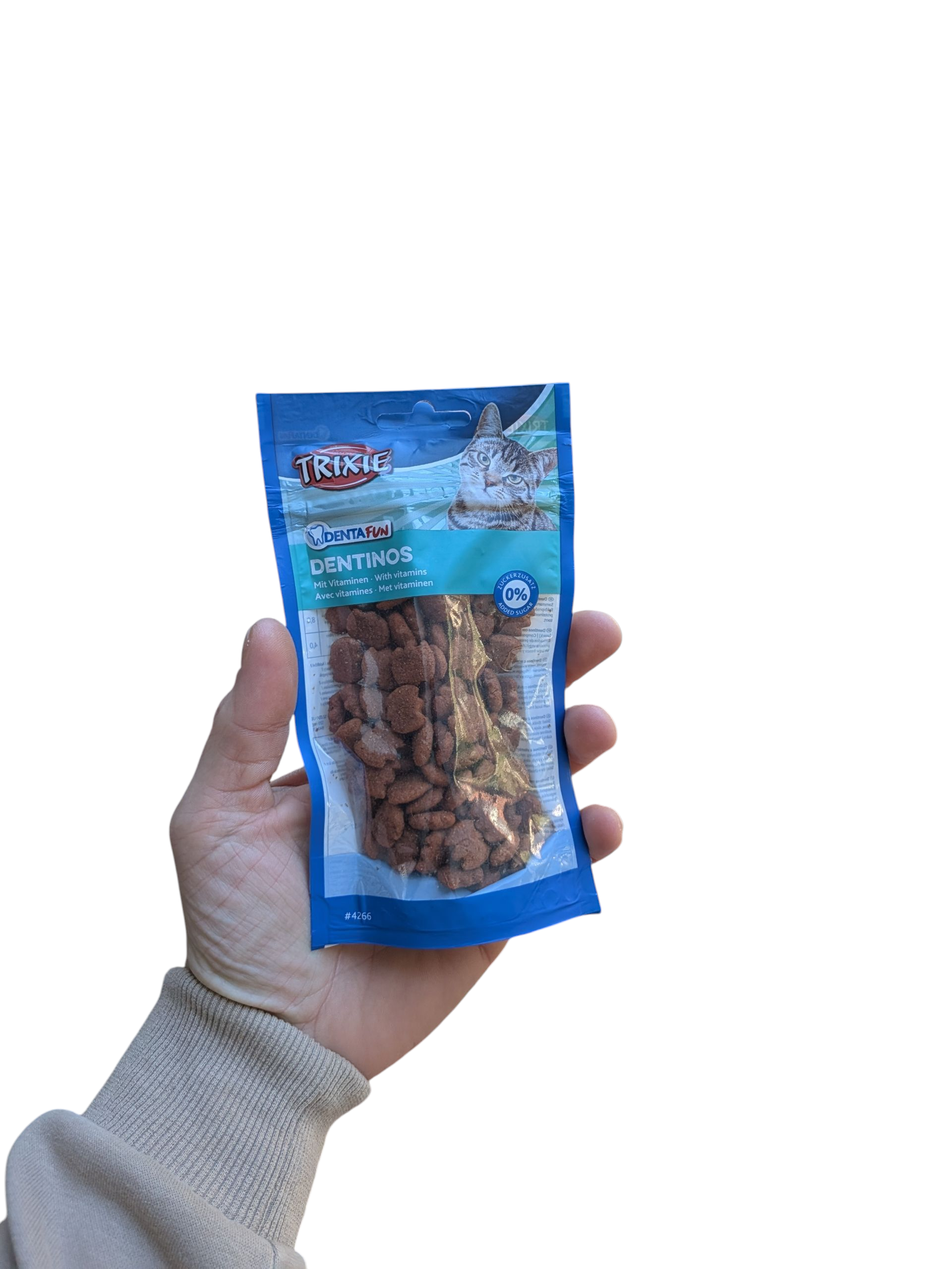 Trixie Denta Fun Dentinoes with Vitamins (50g) are a complementary pet food, tasty cat treats that support healthy teeth and are packed with vitamins. A delicious and healthy snack for your cat! The special shape and consistency of these tasty snacks help to care for your cat's teeth. The material rubs against the teeth during chewing, helping to remove dirt and bacteria, thus reducing plaque and tartar. The treats are also rich in vitamins and therefore a healthy snack. No added sugars!