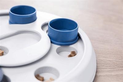 Het bordspel is voorzien van diverse kommetjes, schuifdeksels en een kegel die als stopper fungeert. Door snacks of brokjes onder de deksels of in de kommetjes te verstoppen, moet jouw hond werken om zijn beloning te verdienen. Met de kegel kun je de moeilijkheidsgraad verhogen, zodat het spel uitdagend blijft naarmate jouw hond vaardiger wordt. Dankzij de slipvaste rubberen ring blijft het bord stevig op zijn plek, zelfs tijdens enthousiast speelgedrag.