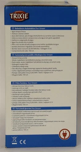 The Trixie Duo Stream drinking fountain provides a constant supply of fresh, oxygenated water for your dog or cat. With two settings, you can choose between a bubbling stream or a gentle flow, depending on your pet's preference. The water circulation contributes to natural cooling and encourages pets to drink more. The activated carbon filter improves water quality by reducing tastes and impurities. The pump has an auto-stop function for extra convenience. The drinking fountain is made of plastic and is energy-efficient. Replacement filters are available separately.
