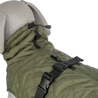 The Trixie Minot Olive Green Dog Jacket is a comfortable and practical jacket that protects your dog from cold, wind, and wet weather. Made of polyester and featuring a soft fleece lining and light padding, this jacket offers warmth and comfort. Thanks to two waterproof zippers, the jacket can be easily combined with both a collar and a harness. Reflective elements ensure extra visibility in the dark. The fit is fully adjustable with drawstrings in the neck and back area, an adjustable belly strap with buckle, and adjustable leg loops for the hind legs. Furthermore, this jacket has been tested and approved by an independent specialized institute for animal welfare and animal protection.