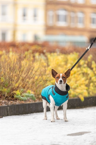 The Trixie Pontis Dog Jacket with Harness, Aqua, 40 cm is a handy coat with a collar for the dog that is water-repellent, with an integrated harness.