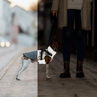 The Trixie Pontis Dog Jacket with Harness Reflective Grey is a warm jacket that optimally protects your dog on dark and cold days. Made entirely of reflective polyester, this jacket ensures maximum visibility, while the fleece lining and warm padding provide comfort and warmth. The continuous zipper on the back makes putting it on and taking it off easy, and the elastic insert in the belly area offers extra flexibility. The collar opening in the neck gives your dog more freedom of movement, and with the adjustable leg loops for the hind legs, the jacket always fits perfectly.