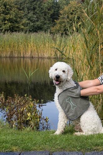 The Trixie Towel with Pockets, Gray, 78x32 cm, is a microfiber towel specifically designed for quickly drying dogs. This handy towel, with its extra-long microfibers, provides excellent moisture and dirt absorption. This ensures ultimate moisture absorption and allows your dog to dry off quickly after a bath or rain shower. The two practical pockets provide a secure grip.