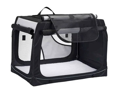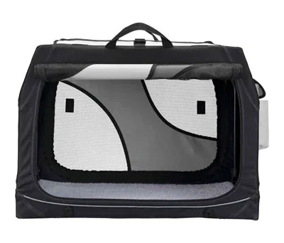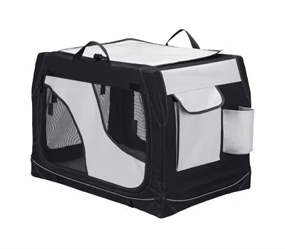 The Trixie Vario Travel Carrier Black/Grey 99x65x71 cm is a sturdy transport box made of durable polyester with a metal frame. The travel carrier can be opened on three sides and features mesh inserts for good ventilation. The top mesh insert can be covered for the dog's protection. The Velcro on the bottom of the box keeps it securely in place, and the removable flap protects the bumper from scratches. Loops on the bottom and pegs allow the travel carrier to be used outdoors in nature. The box has a side pocket and a bottle holder. The removable bottom with sheepskin look gives the dog a comfortable feeling!
