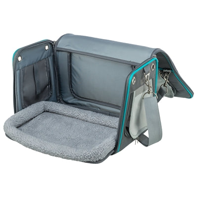 The Trixie Travel Bag Vicky Rodent with Removable Inner Cushion Grey 40x27x28 cm is a transport bag for rodents and rabbits. Give your rodent comfort and safety on the go with this travel bag, designed to provide a feeling of home where they can retreat. This bag features a removable inner cushion, handy for vet visits, for example. Coverable mesh inserts and ventilation holes ensure optimal air circulation. The sturdy EVA/polyester material maintains its shape. The bag opens fully on the side and front for easy access. Complete with a removable handle and shoulder strap for carrying comfort. A handy outer pocket offers extra storage space. This travel bag offers the perfect combination of functionality and comfort for on the go.