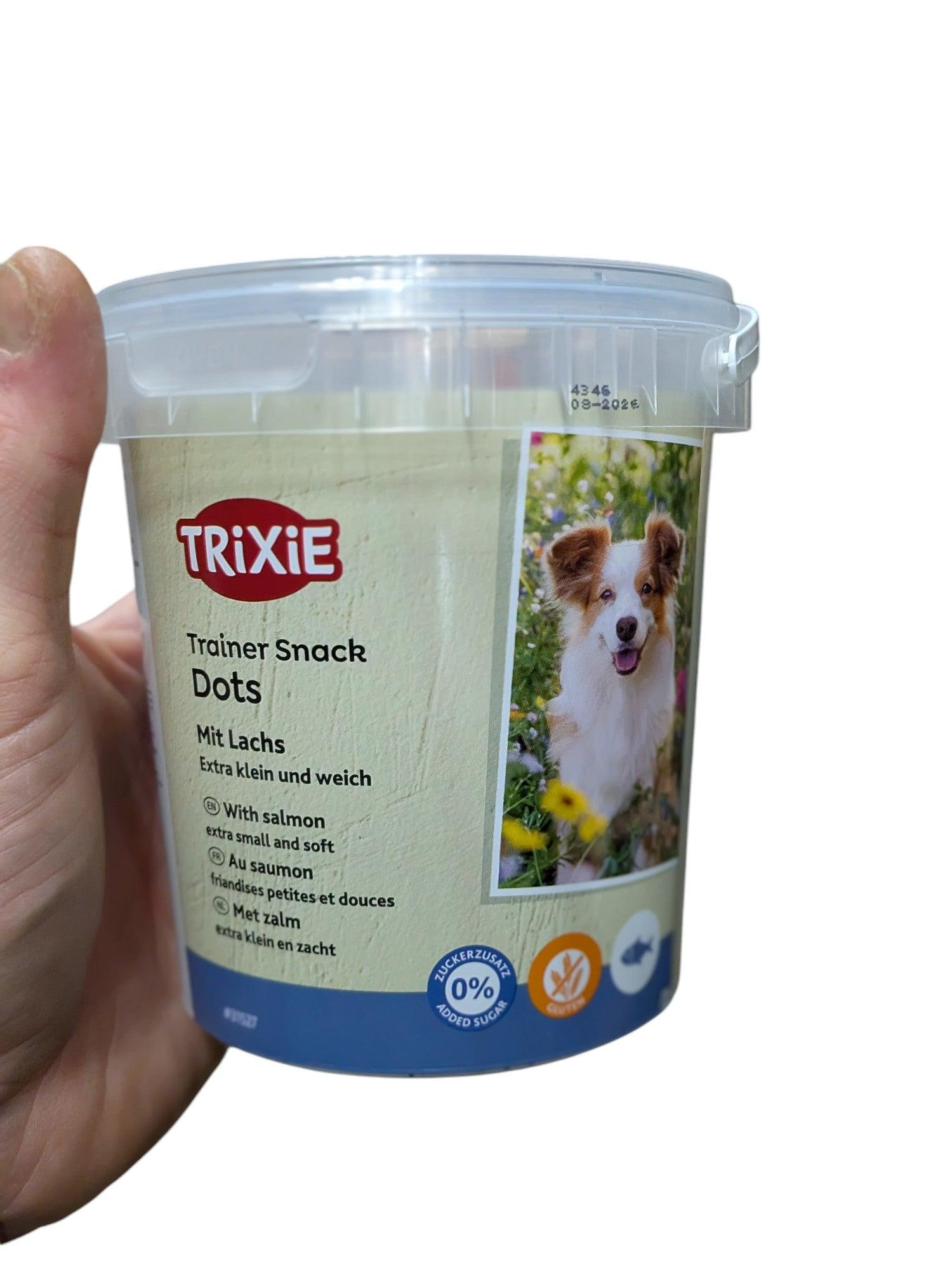 The 500g Trixie Soft Trainer Mini Trainer Dots are a supplementary pet food in the form of soft salmon-flavored dog treats. Their small size makes them perfect for training rewards. The treats are made without added sugars and are gluten-free, making them ideal for your training sessions. Deliciously soft and irresistible!