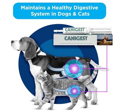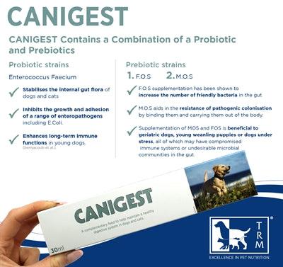 TRM Canigest 30 ml is a palatable paste for dogs and cats to support their digestive system. The power of Canigest lies in its quadrupel action formula, a powerful mix of beneficial bacteria that restore the gut flora. It contains a combination of probiotics, prebiotics, glutamine, kaolin, and pectin, specially designed to support the treatment of digestive problems in pets. Canigest paste is easy to dose and can help with: