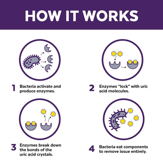Mocz, to pospolite źródło powstawania nieprzyjemnego zapachu oraz plam, które mogą prowadzić do szerzenia się szeregu infekcji. Jest trudny do usunięcia, ponieważ skrystalizowany kwas moczowy pozostaje widoczny jako plamy w fugach czy na innych porowatych powierzchniach nawet na lata. Tradycyjne odplamiacze usuwają składniki moczu, ale nie niszczą jego podstawowego komponentu – kwasu moczowego. Większość domowych środków do czyszczenia plam pochodzących z moczu tylko maskują nieprzyjemne zapachy lub też usuwają je tylko na jakiś czas. W przeciwieństwie do nich, Urine Off „zjada” proteiny oraz kryształy kwasu moczowego usuwając tym samym przyjazne rozwojowi bakterii środowisko.