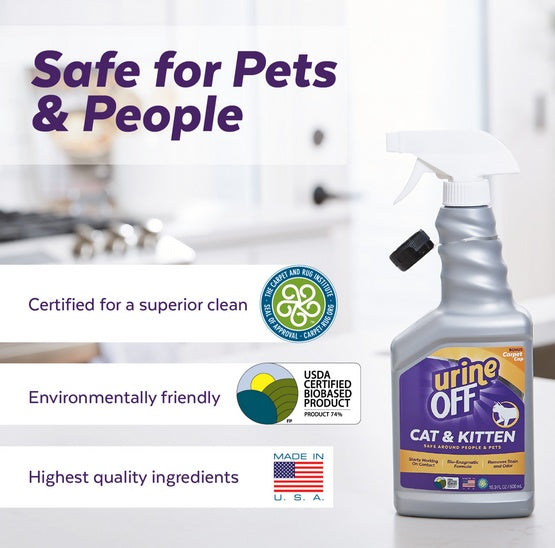Urine Off całkowicie i dokładnie usuwa plamy moczu oraz nieprzyjemne zapachy.
