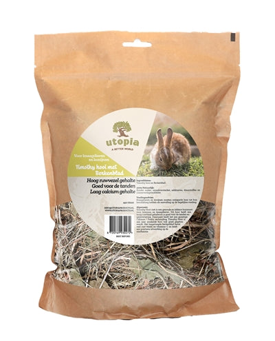 Utopia Timothy Hay with Birch Leaves (450g) is a supplementary animal feed for rabbits and rodents with a high fiber content. Timothy hay is a healthy and tasty type of hay for rabbits and rodents. This hay has a high fiber content and is good for teeth and digestion. It also has a favorable calcium/phosphorus ratio. Timothy hay is very palatable and readily eaten. The added birch leaves contain a lot of fiber and vitamin C. It also has a positive effect on kidney function. This hay is 100% natural, without sugar, flavor enhancers, additives, colorings, or preservatives.
