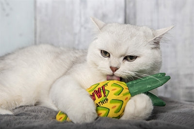 Yeowww Pineapple is a cat toy shaped like a pineapple and filled with catnip. The durable cotton cover of the pineapple is completely filled with 41 grams of 100% organic catnip, without fillers or chemicals. The pineapple has crinkly spikes for extra texture and sound, ensuring maximum playtime fun.